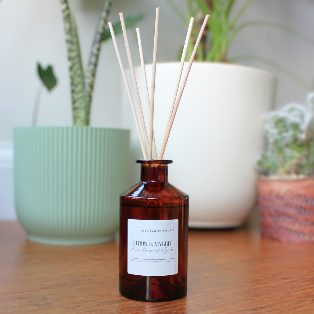 Seed Pantry Reed Diffusers are crafted with 100% pure essential oils and a plant-based carrier for a clean, steady diffusion that gently restores the atmosphere of any room. Designed for kitchens, living spaces, work corners — anywhere that needs a touch of clarity and a moment of calm.