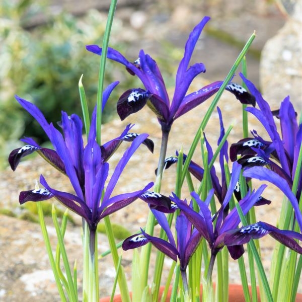 Iris reticulata 'Blue note': Reticulata species irises are dwarf flowering bulbous perennials and fully hardy. Rich violet-blue flowers with contrasting white and yellow markings with a slight fragrance. Ht: 15cm, x10 bulbs.