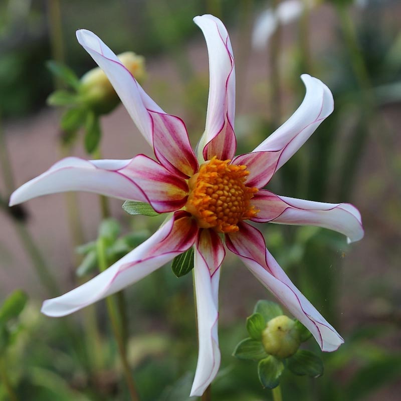 White, star-like blooms with inrolled petals delicately outlined in soft red that radiate from a central yellow eye. Tender Perennial. x 1 tuber for planting. Height: 90cm, Flowering time: June to November, Preferred conditions: Full sun, or part shade.