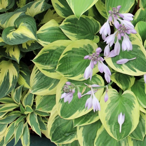 Outstanding blue-green foliage with creamy white margins, forming a thick mound of large heart-shaped leaves. Dense racemes of pale lilac, bell-shaped flowers, stems to 1m. H. 75cm/1m wide. x1 bare root plant in the Grow Club.