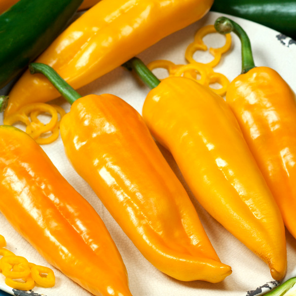 Yellow sweet pepper. Producing 20cm long “bull’s horn” shaped fruits. The thick-walled peppers have a sweet flavour and are great eaten raw, roasted or grilled. x1 seed packet.