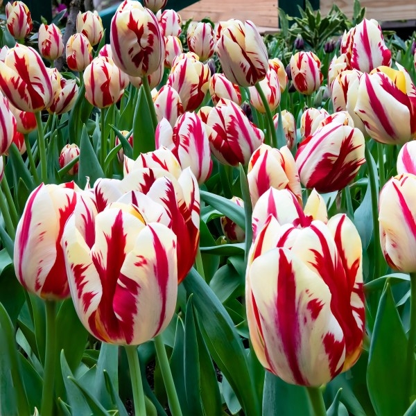 Beautiful flowers, rich cream fading to white, with deep red flames. This Triumph tulip is a must for your garden!. x4 top size (12+) bulbs to plant in pots, containers and borders. Height: 40cm, Flowering time: April to May, Preferred conditions: Full sun, or part shade. (AGM - RHS - Award of garden Merit)